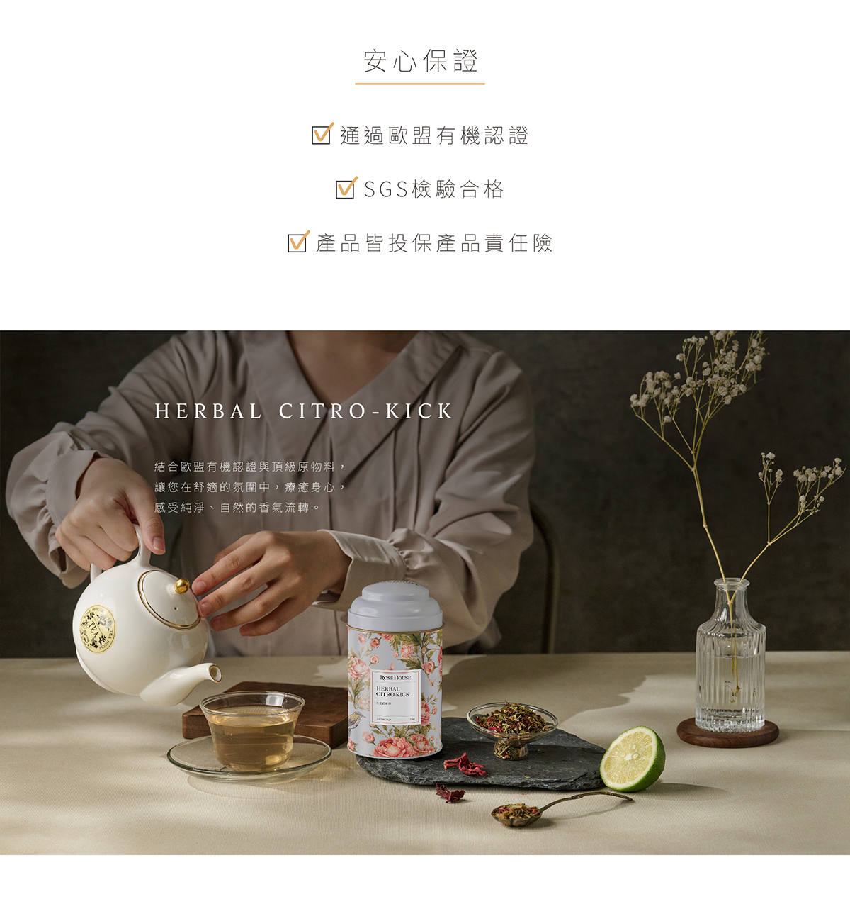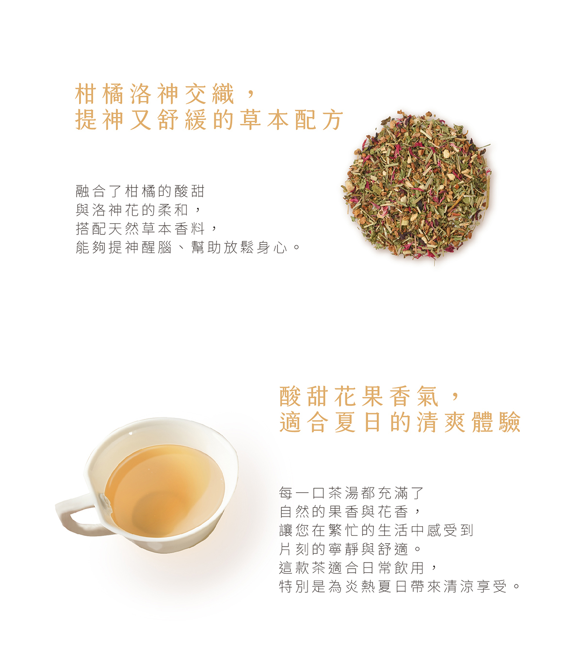 來自德國,通過歐盟有機認證,精選柑橘果皮與洛神花為主調,揉合天然草本香料,調和出酸甜中帶花韻的柔美氣息。茶湯透亮輕盈,入口即展現柑橘的清新果香與洛神的雅致花氣,溫潤提神,亦能放鬆身心。無論晨起醒腦或午後沉靜時刻,都能為日常注入一抹清新明亮的能量,是一杯為生活而生的花草茶選擇。