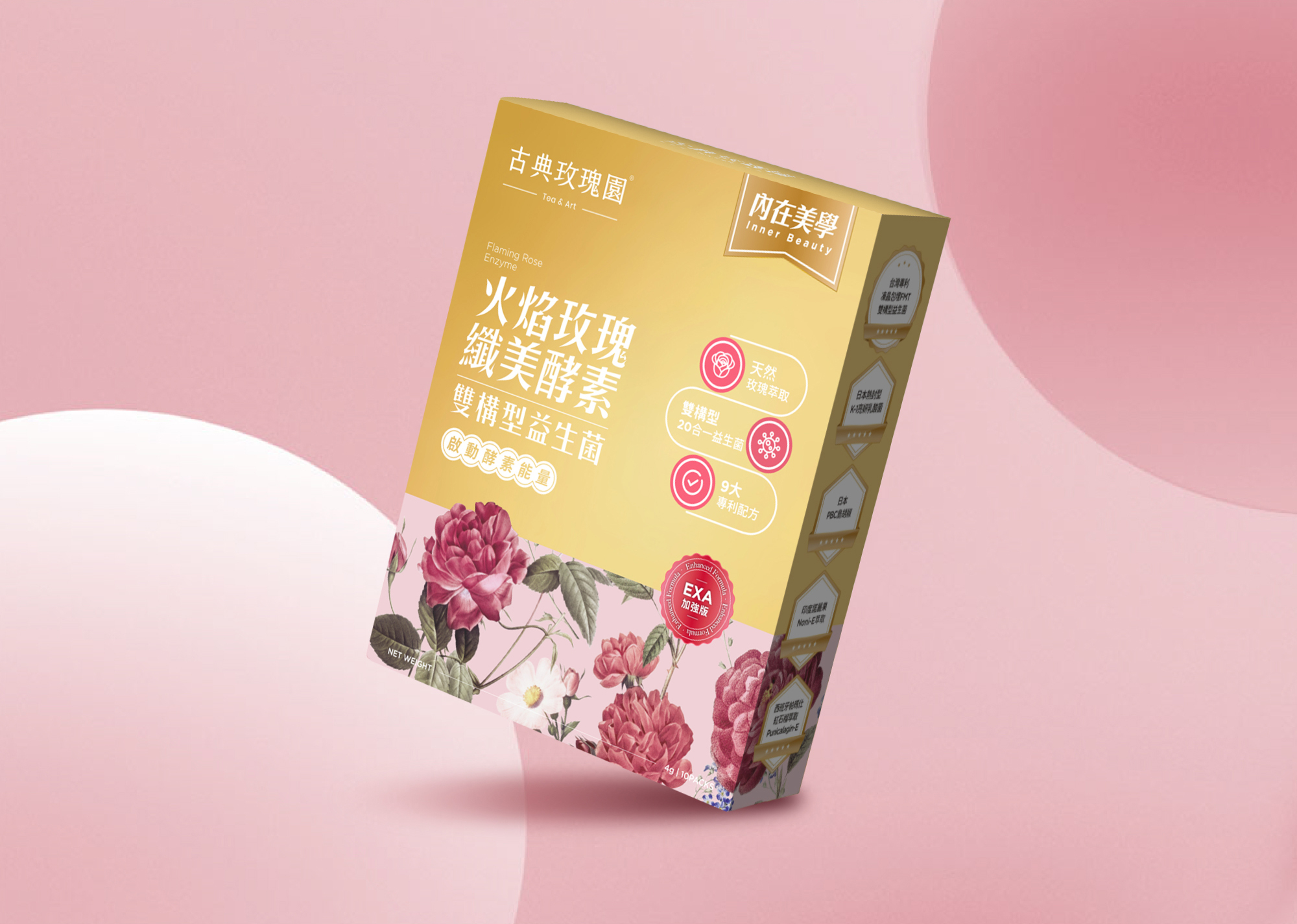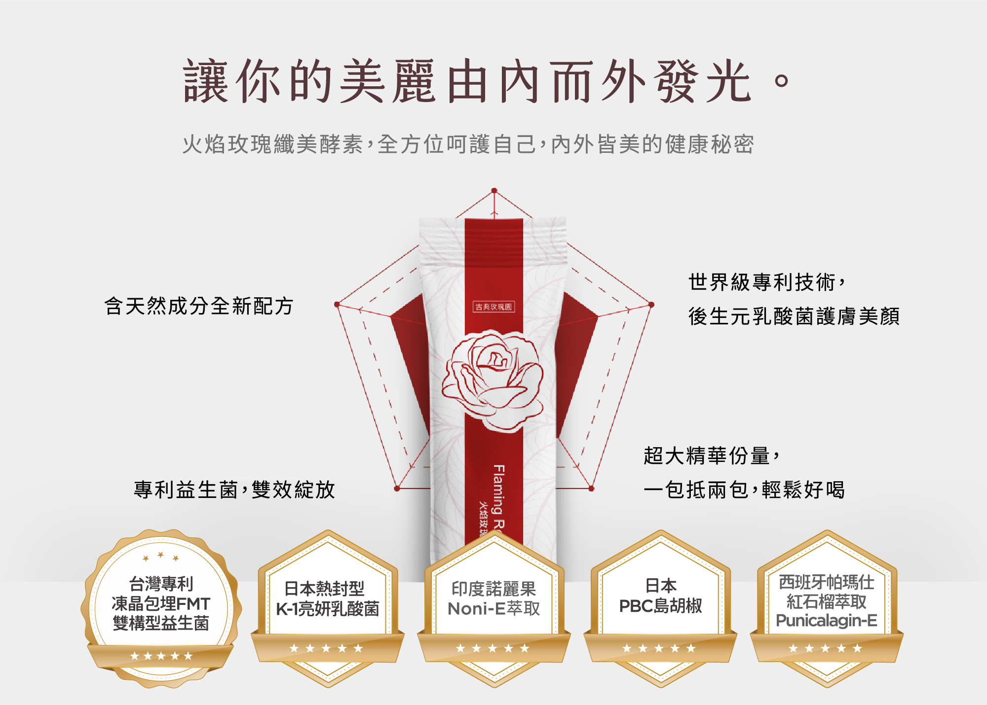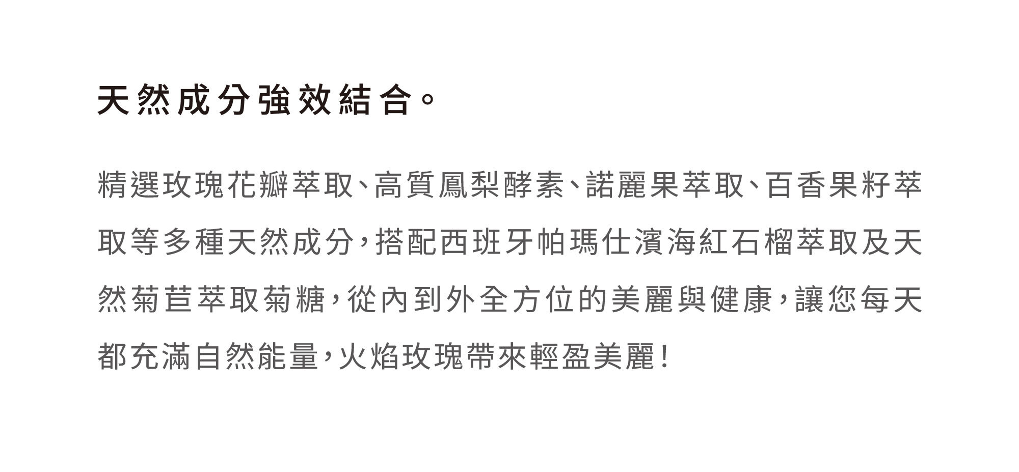 精選玫瑰花瓣萃取、高質鳳梨酵素、諾麗果萃取、百香果籽萃取等多種天然成分,搭配西班牙帕瑪仕濱海紅石榴萃取及天然菊苣萃取菊糖,從內到外全方位的美麗與健康,讓您每天都充滿自然能量,火焰玫瑰帶來輕盈美麗!