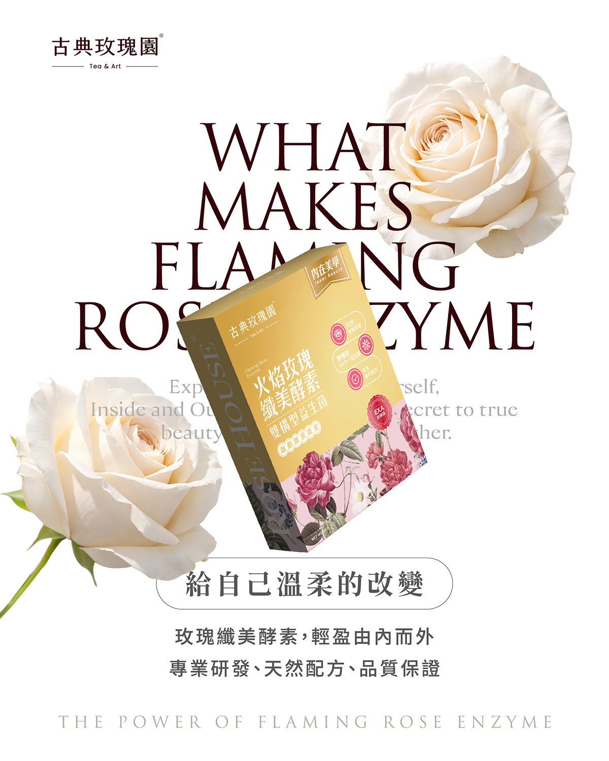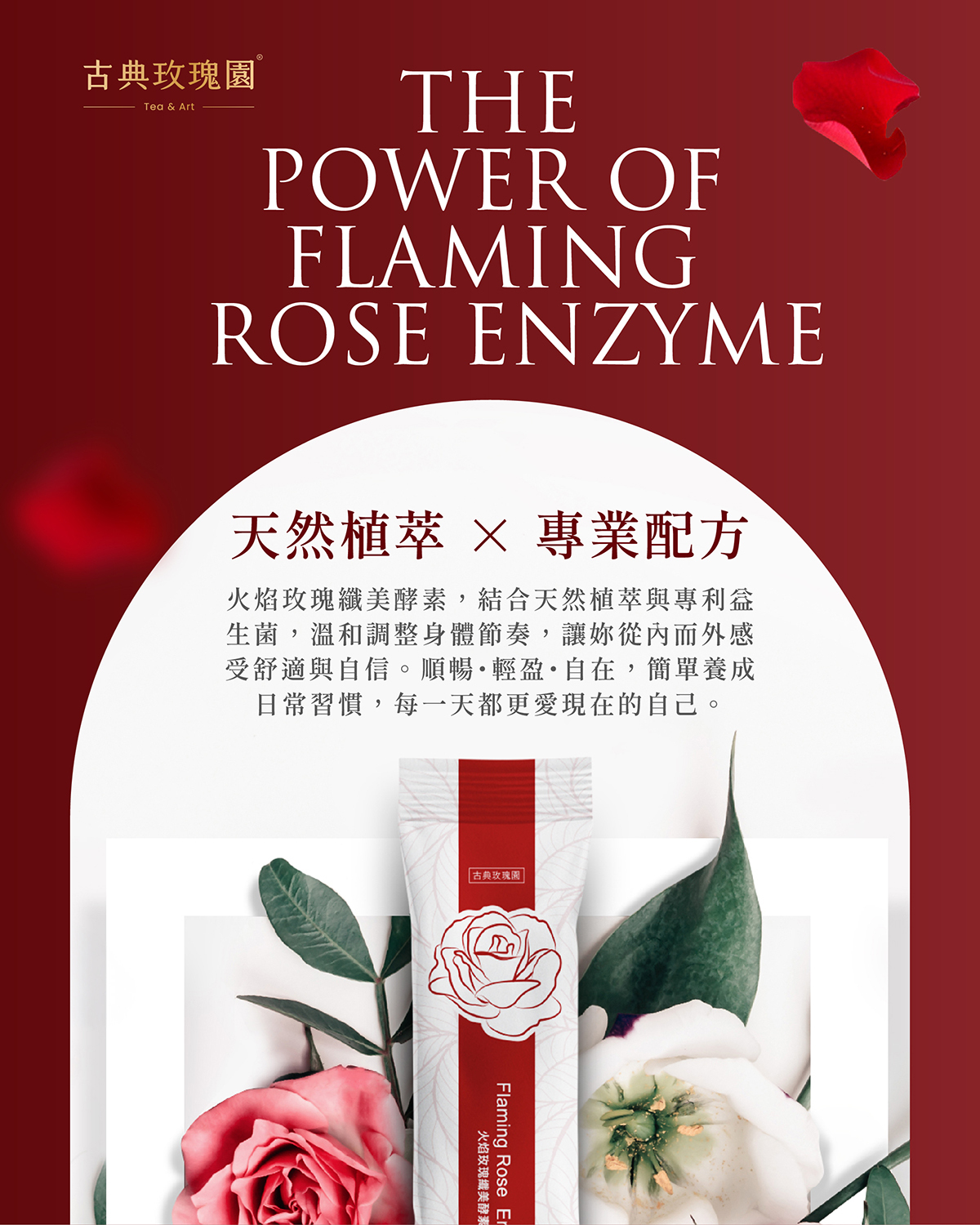 火焰玫瑰纖美酵素,由台灣英式下午茶文化及玫瑰代表品牌古典玫瑰園推出,延續品牌三十多年來的專業製茶精神與對品質的承諾,結合現代女性對日常健康與輕盈體態的需求,打造出每日一包的全方位日常呵護選擇。