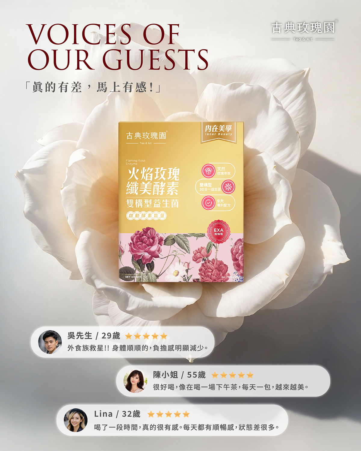 每日一包火焰玫瑰纖美酵素,從內到外的日常照顧,簡單、專業、安心,讓身體逐步回到自然節奏,輕盈自信地迎接每一天。