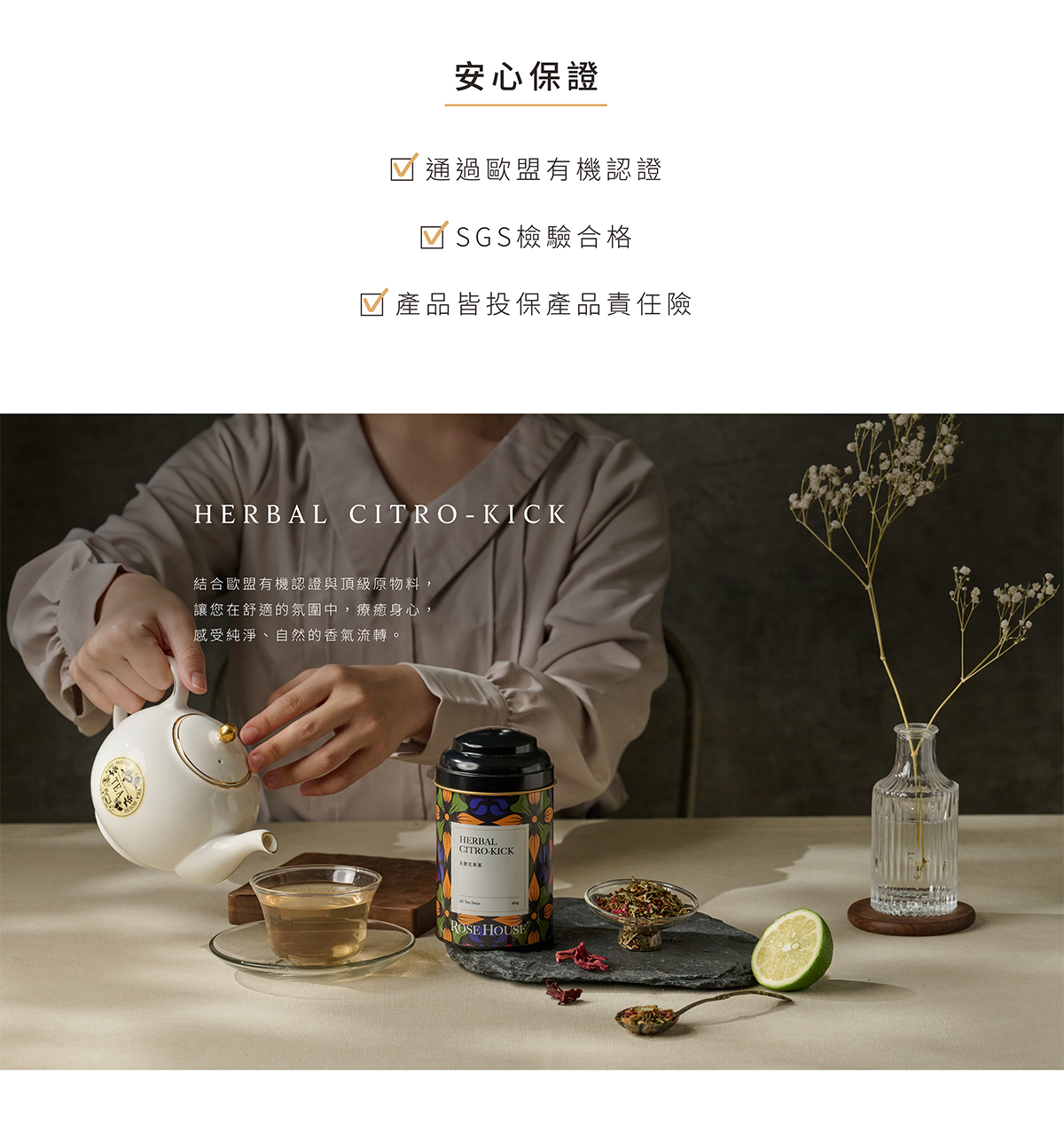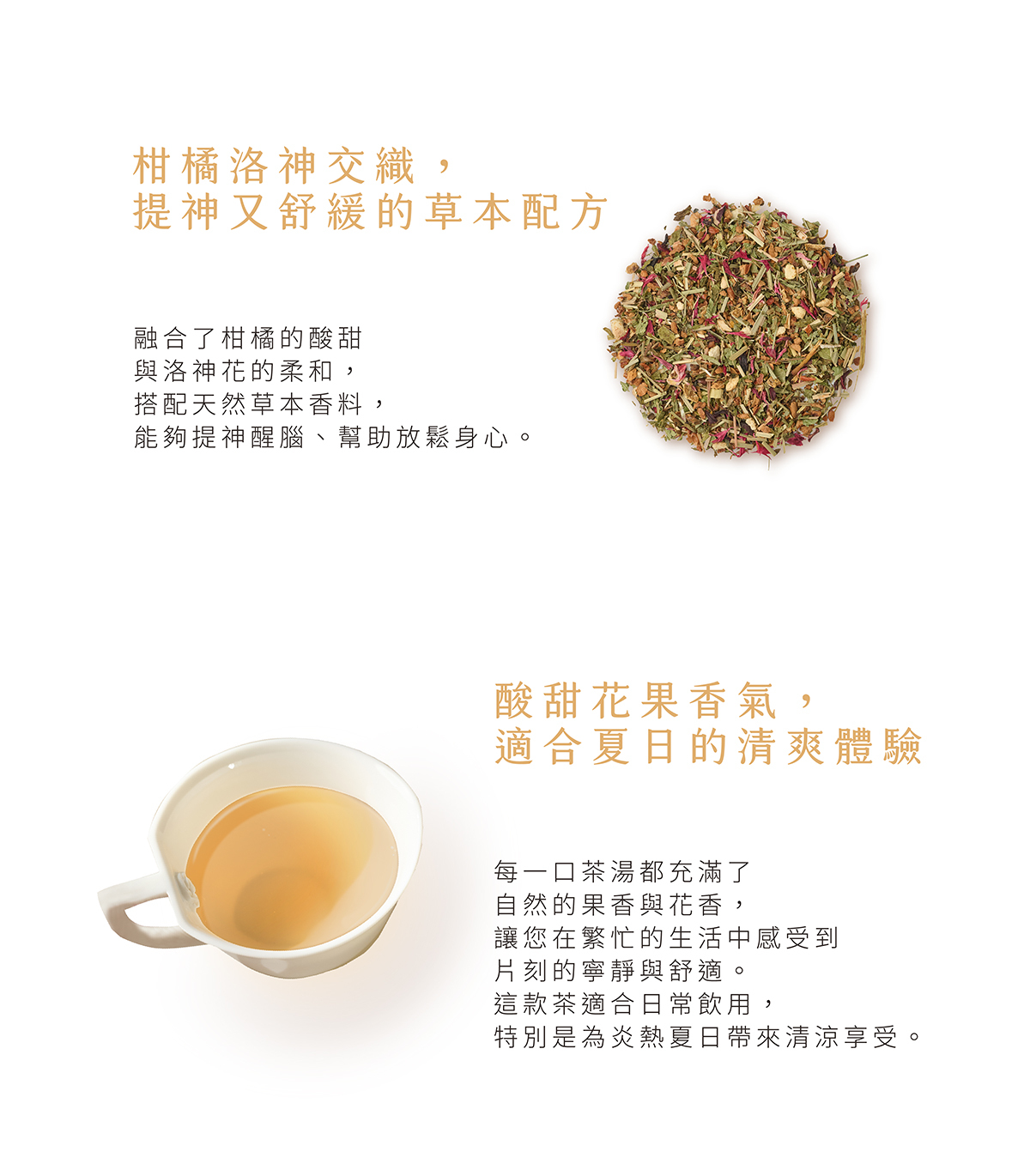 來自德國,通過歐盟有機認證,精選柑橘果皮與洛神花為主調,揉合天然草本香料,調和出酸甜中帶花韻的柔美氣息。茶湯透亮輕盈,入口即展現柑橘的清新果香與洛神的雅致花氣,溫潤提神,亦能放鬆身心。無論晨起醒腦或午後沉靜時刻,都能為日常注入一抹清新明亮的能量,是一杯為生活而生的花草茶選擇。
