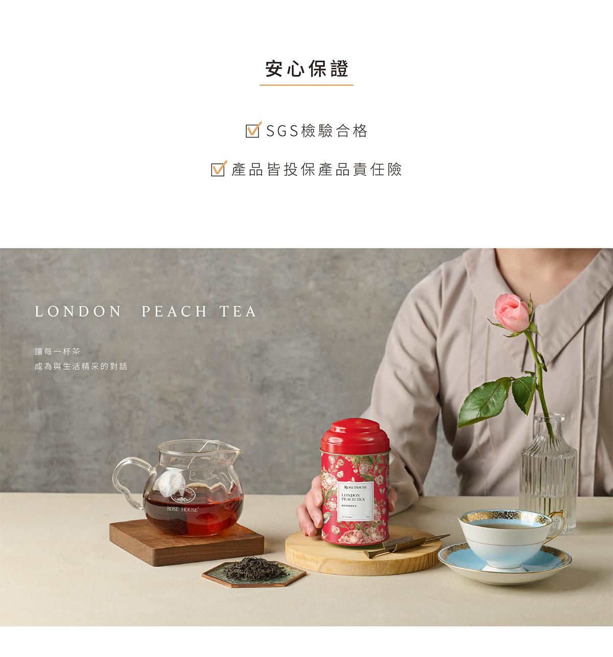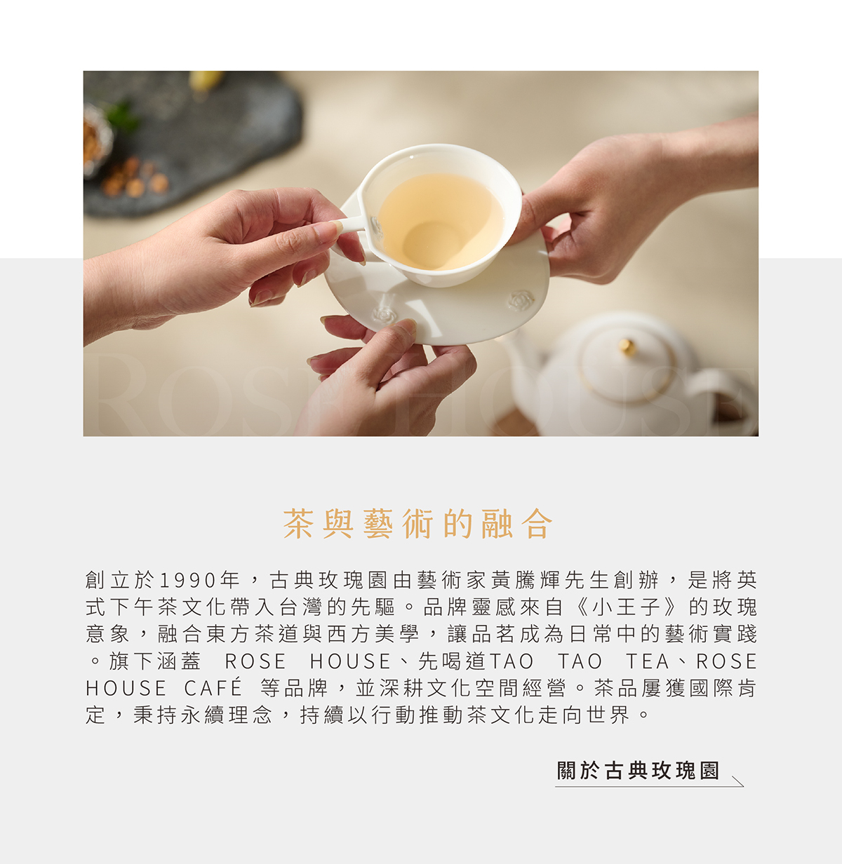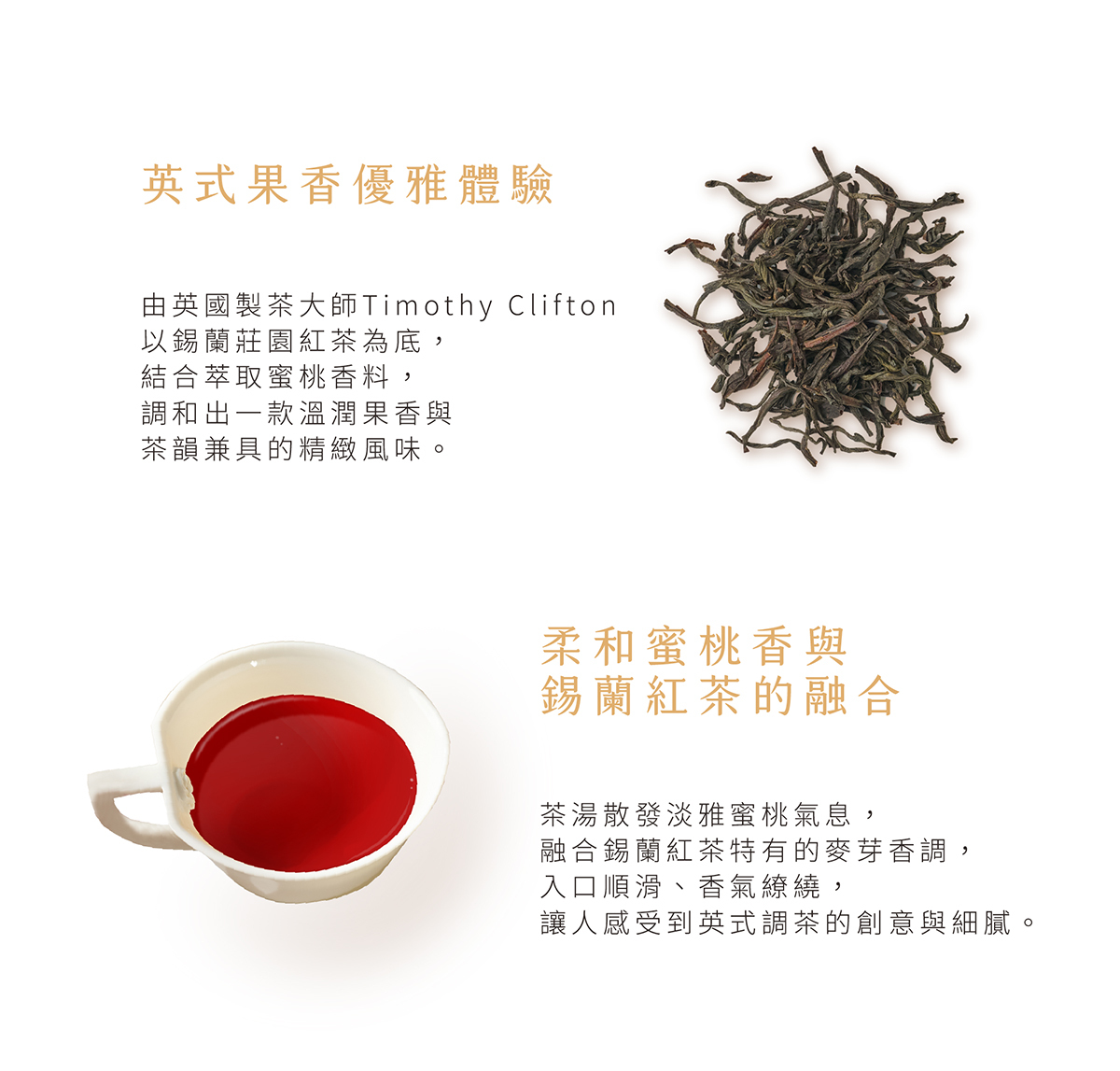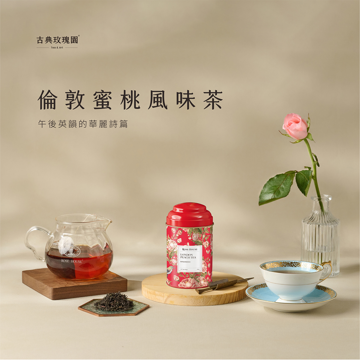 由英國製茶大師 Timothy Clifton 為古典玫瑰園獨家調配,以錫蘭莊園紅茶為基底,融合天然蜜桃香氣,將麥芽氣息與果香交織出溫潤優雅的風味層次。茶湯入口細膩,尾韻清甜綿長,令人忍不住一口接一口。這不僅是一杯茶,更是一次對英式茶藝與生活美學的輕奢詮釋。無論獨飲或佐英式甜點,都是午後時光最華麗從容的選擇。