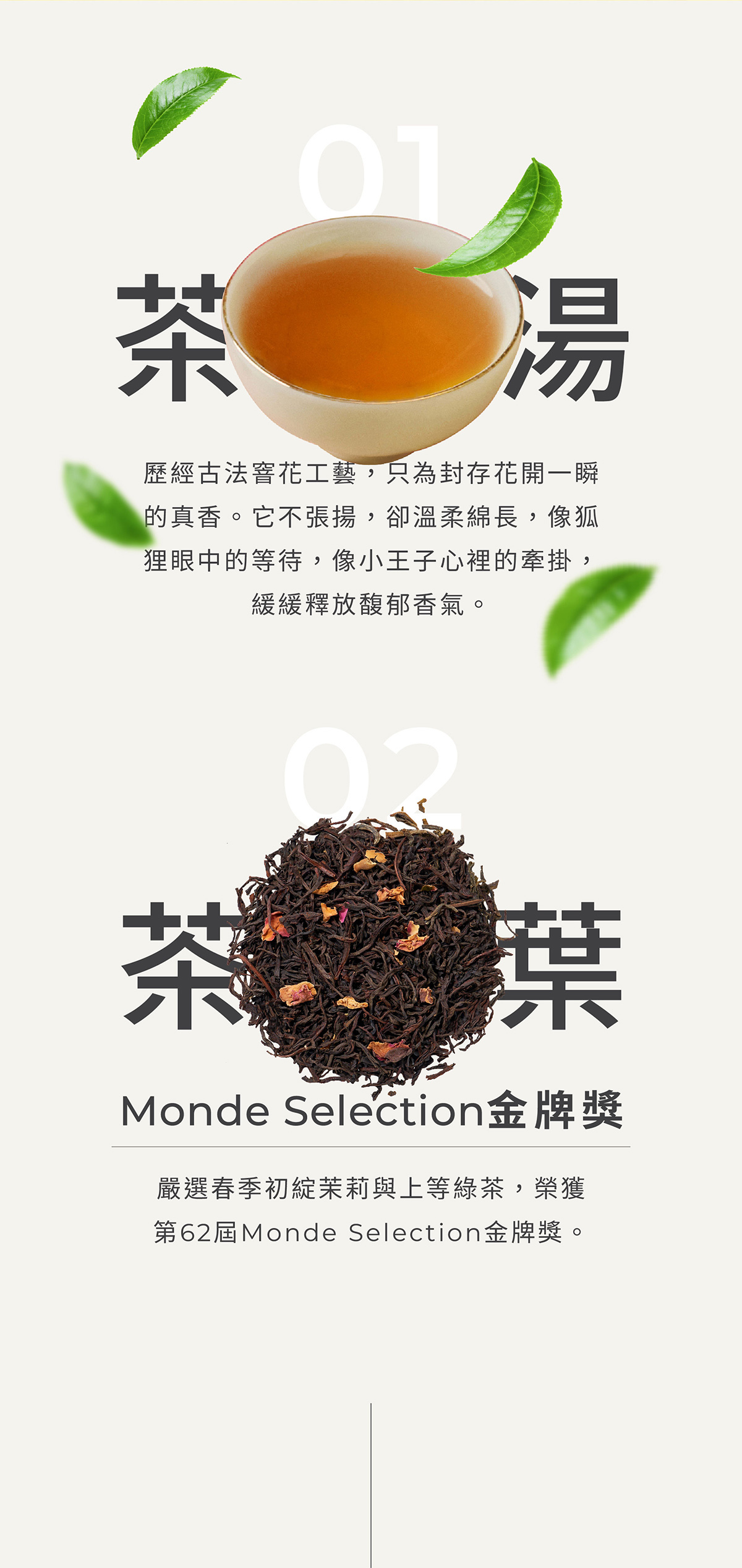 狐狸的秘密(極品茉莉花茶),嚴選春季初綻茉莉與上等綠茶,榮獲第62屆Monde Selection金牌獎。