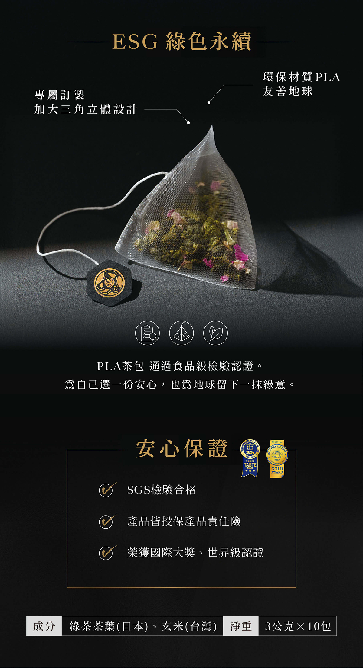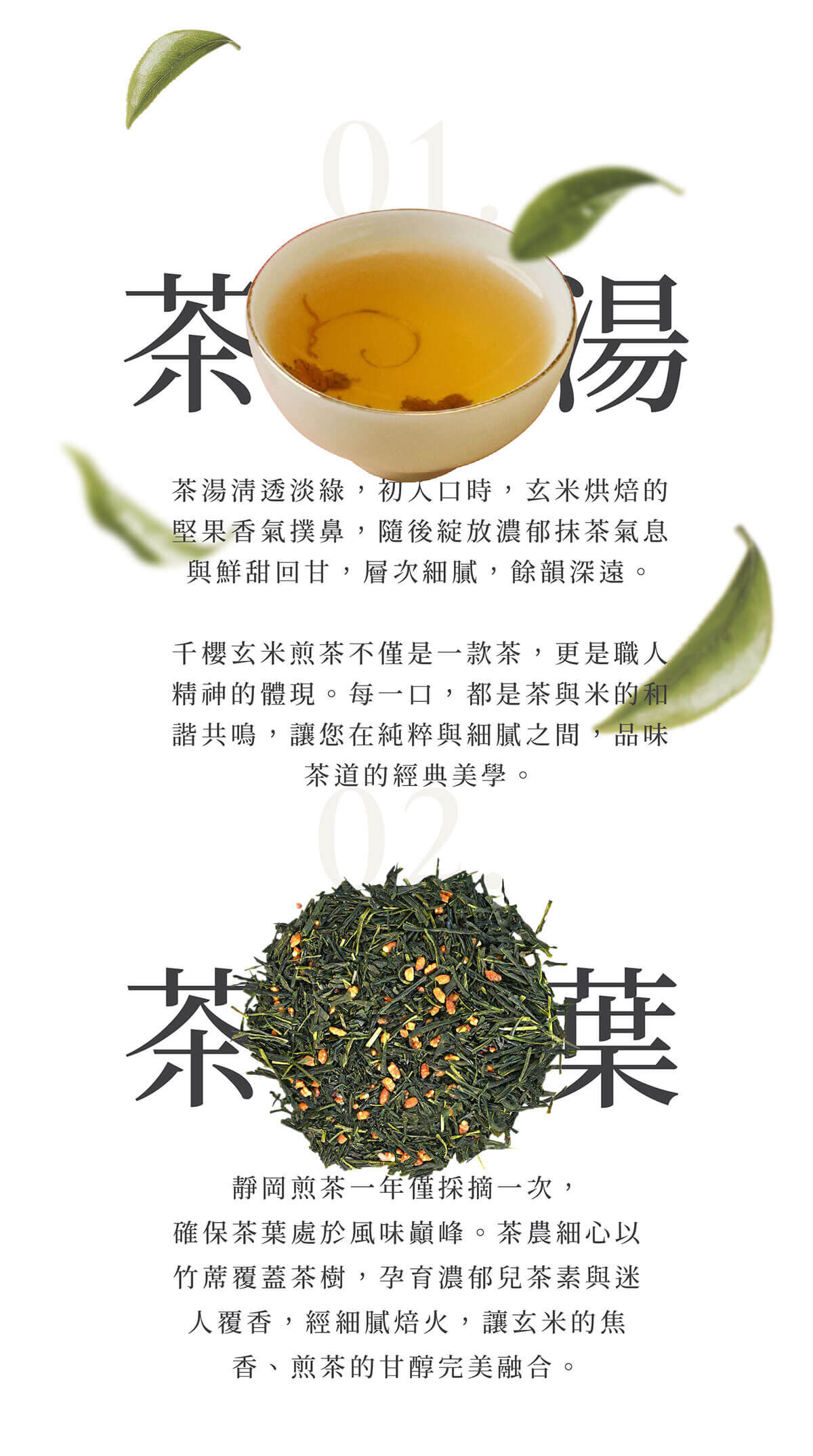 嚴選日本靜岡頂級煎茶與台灣冠軍米,經細膩焙火調和,玄米焦香與煎茶甘醇交織,展現茶與米的和諧共鳴。茶湯清透,層次豐富,鮮甜回甘,餘韻悠長,邀您品味極致茶道之美。