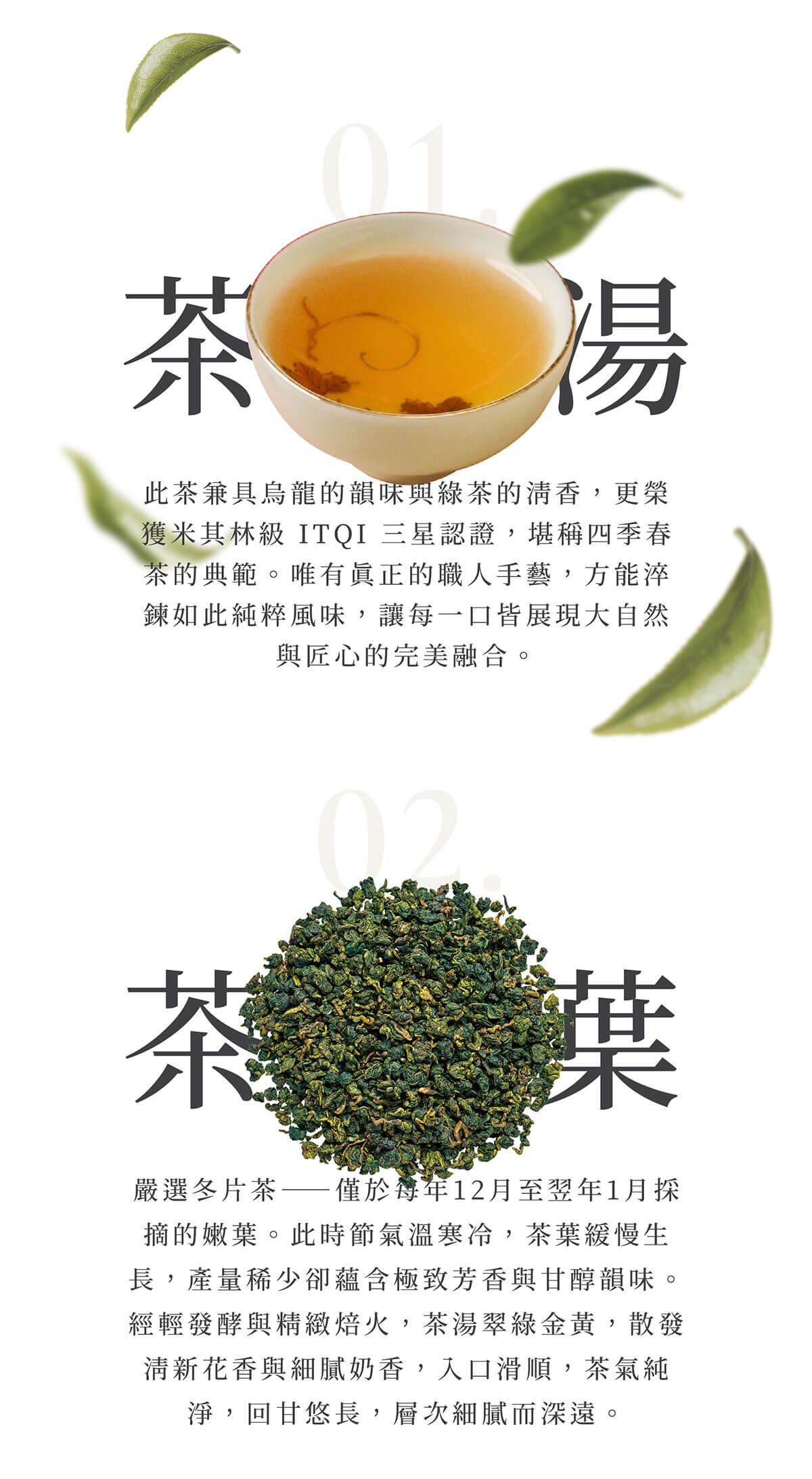嚴選南投鹿谷冬片茶,雲霧滋養,日夜溫差孕育豐富茶韻。茶湯翠綠金黃,清新花香交織細緻奶香,入口滑順,回甘悠長。榮獲米其林級ITQI三星認證,展現四季春茶的極致典範。