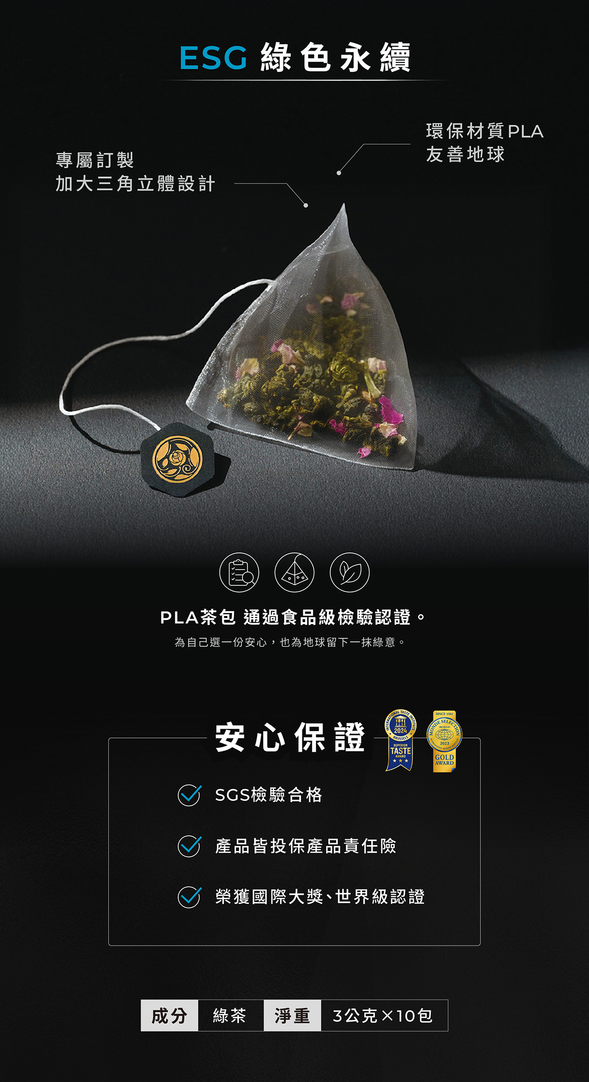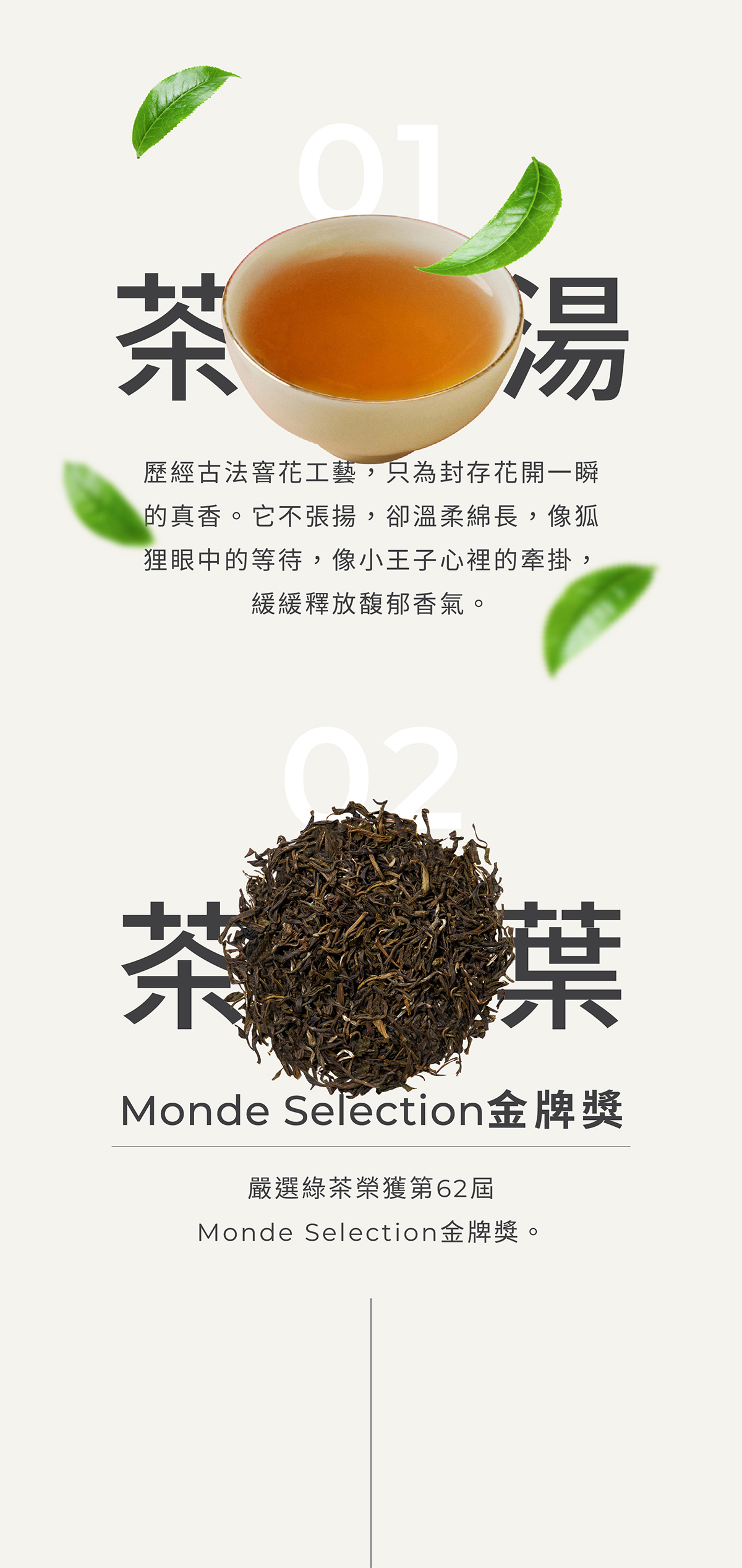 極品茉莉花茶,嚴選綠茶,榮獲第62屆Monde Selection金牌獎。